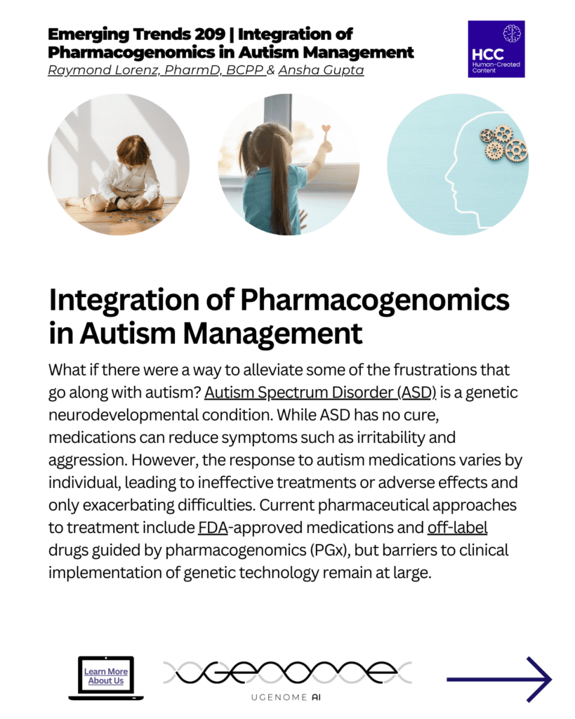 Integration of Pharmacogenomics in Autism Management. What if there were a way to alleviate some of the frustrations that go along with autism? Autism Spectrum Disorder (ASD) is a genetic neurodevelopmental condition. While ASD has no cure, medications can reduce symptoms such as irritability and aggression. However, the response to autism medications varies by individual, leading to ineffective treatments or adverse effects and only exacerbating difficulties. Current pharmaceutical approaches to treatment include FDA-approved medications and off-label drugs guided by pharmacogenomics (PGx), but barriers to clinical implementation of genetic technology remain at large.