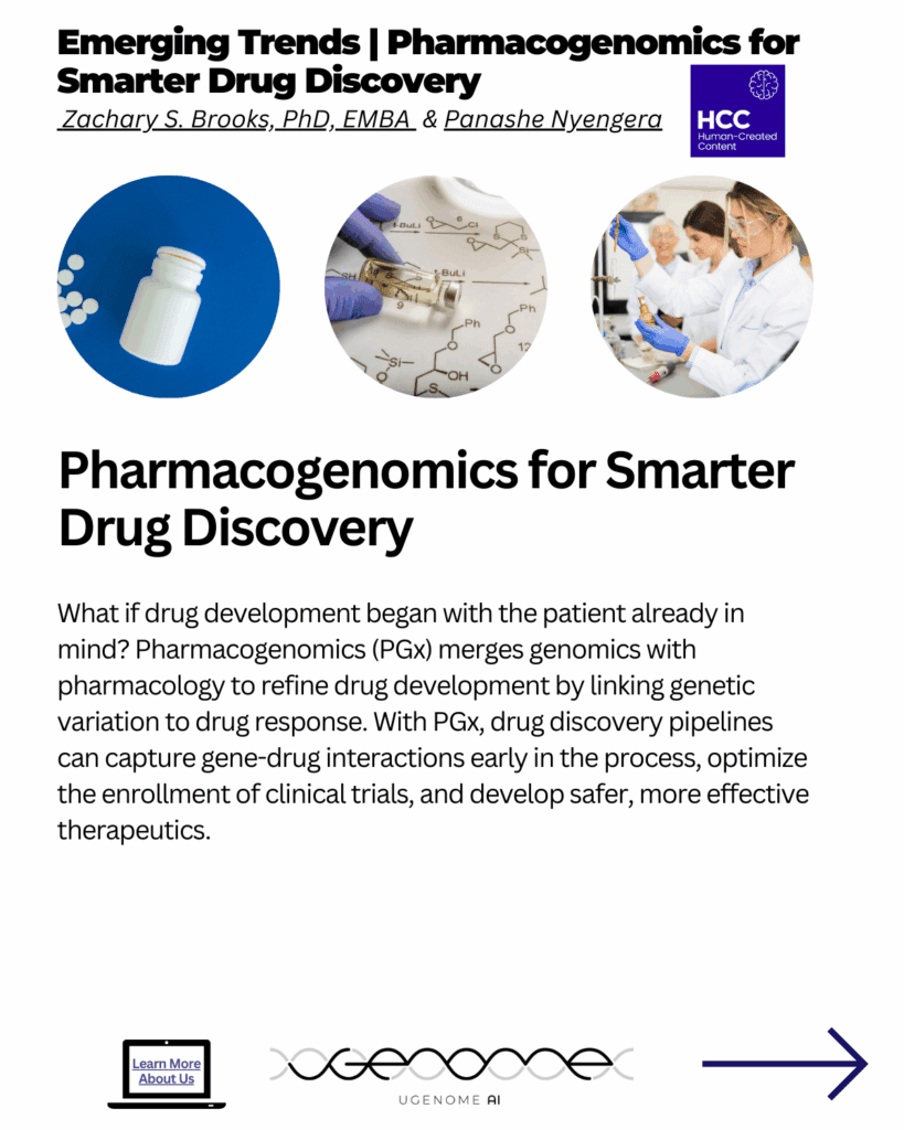 Pharmacogenomics for Smarter Drug Discovery. What if drug development began with the patient already in mind? Pharmacogenomics (PGx) merges genomics with pharmacology to refine drug development by linking genetic variation to drug response. With PGx, drug discovery pipelines can capture gene-drug interactions early in the process, optimize the enrollment of clinical trials, and develop safer, more effective therapeutics.