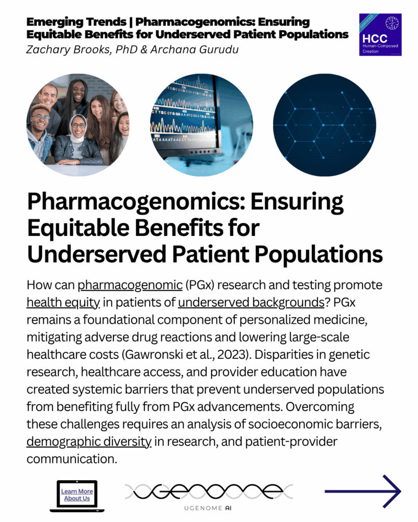 Pharmacogenomics: Ensuring Equitable Benefits for Underserved Patient Populations. How can pharmacogenomic (PGx) research and testing promote health equity in patients of underserved backgrounds? PGx remains a foundational component of personalized medicine, mitigating adverse drug reactions and lowering large-scale healthcare costs (Gawronski et al., 2023). Disparities in genetic research, healthcare access, and provider education have created systemic barriers that prevent underserved populations from benefiting fully from PGx advancements. Overcoming these challenges requires an analysis of socioeconomic barriers, demographic diversity in research, and patient-provider communication.
