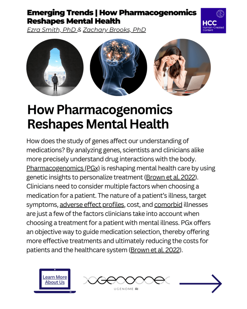 How Pharmacogenomics Reshapes Mental Health. How does the study of genes affect our understanding of medications? By analyzing genes, scientists and clinicians alike more precisely understand drug interactions with the body. Pharmacogenomics (PGx) is reshaping mental health care by using genetic insights to personalize treatment (Brown et al. 2022). Clinicians need to consider multiple factors when choosing a medication for a patient. The nature of a patient’s illness, target symptoms, adverse effect profiles, cost, and comorbid illnesses are just a few of the factors clinicians take into account when choosing a treatment for a patient with mental illness. PGx offers an objective way to guide medication selection, thereby offering more effective treatments and ultimately reducing the costs for patients and the healthcare system (Brown et al. 2022).