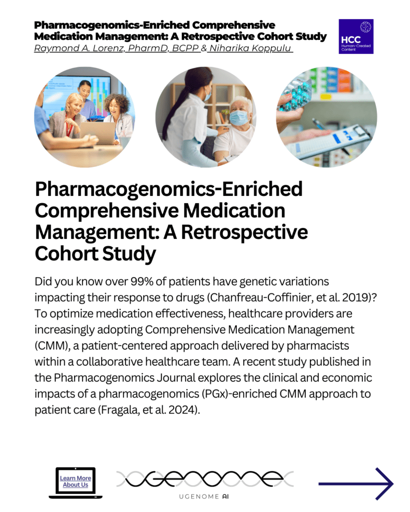 Pharmacogenomics-Enriched Comprehensive Medication Management: A Retrospective Cohort Study. Did you know over 99% of patients have genetic variations impacting their response to drugs (Chanfreau-Coffinier, et al. 2019)? To optimize medication effectiveness, healthcare providers are increasingly adopting Comprehensive Medication Management (CMM), a patient-centered approach delivered by pharmacists within a collaborative healthcare team. A recent study published in the Pharmacogenomics Journal explores the clinical and economic impacts of a pharmacogenomics (PGx)-enriched CMM approach to patient care (Fragala, et al. 2024).
