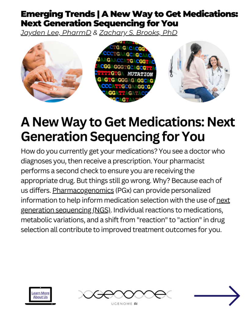 A New Way to Get Medications: Next Generation Sequencing for You. How do you currently get your medications? You see a doctor who diagnoses you, then receive a prescription. Your pharmacist performs a second check to ensure you are receiving the appropriate drug. But things still go wrong. Why? Because each of us differs. Pharmacogenomics (PGx) can provide personalized information to help inform medication selection with the use of next generation sequencing (NGS). Individual reactions to medications, metabolic variations, and a shift from "reaction" to "action" in drug selection all contribute to improved treatment outcomes for you.