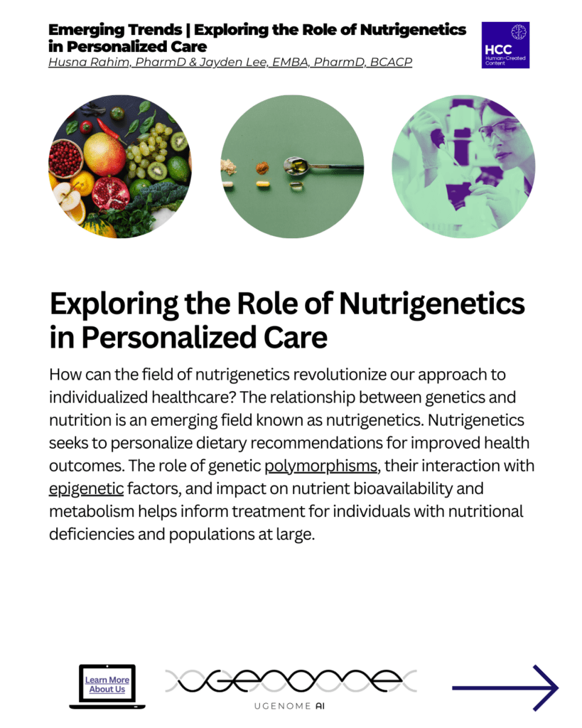 Exploring the Role of Nutrigenetics in Personalized Care. How can the field of nutrigenetics revolutionize our approach to individualized healthcare? The relationship between genetics and nutrition is an emerging field known as nutrigenetics. Nutrigenetics seeks to personalize dietary recommendations for improved health outcomes. The role of genetic polymorphisms, their interaction with epigenetic factors, and impact on nutrient bioavailability and metabolism helps inform treatment for individuals with nutritional deficiencies and populations at large.
