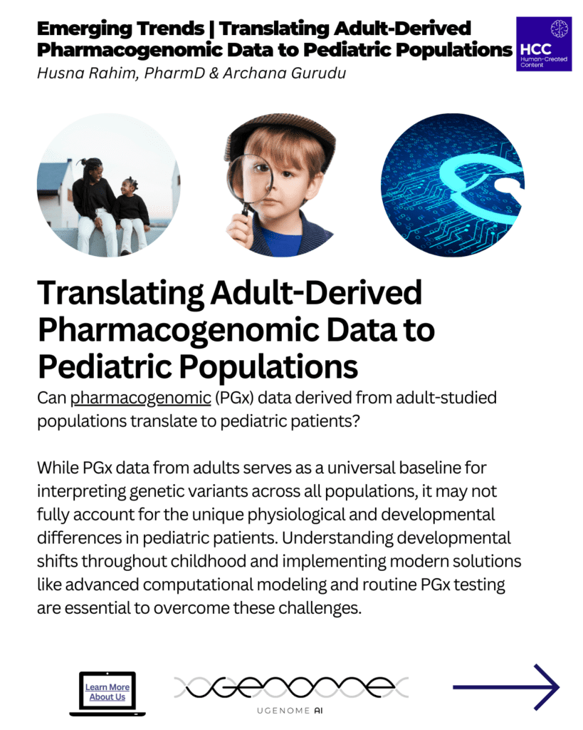 Translating Adult-Derived Pharmacogenomic Data to Pediatric Populations. Can pharmacogenomic (PGx) data derived from adult-studied populations translate to pediatric patients? While PGx data from adults serves as a universal baseline for interpreting genetic variants across all populations, it may not fully account for the unique physiological and developmental differences in pediatric patients. Understanding developmental shifts throughout childhood and implementing modern solutions like advanced computational modeling and routine PGx testing are essential to overcome these challenges.