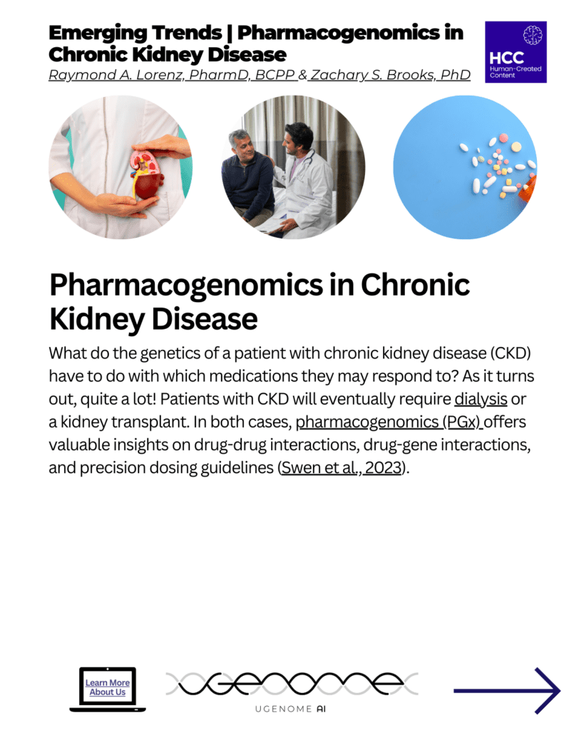 Pharmacogenomics in Chronic Kidney Disease. What do the genetics of a patient with chronic kidney disease (CKD) have to do with which medications they may respond to? As it turns out, quite a lot! Patients with CKD will eventually require dialysis or a kidney transplant. In both cases, pharmacogenomics (PGx) offers valuable insights on drug-drug interactions, drug-gene interactions, and precision dosing guidelines (Swen et al., 2023).