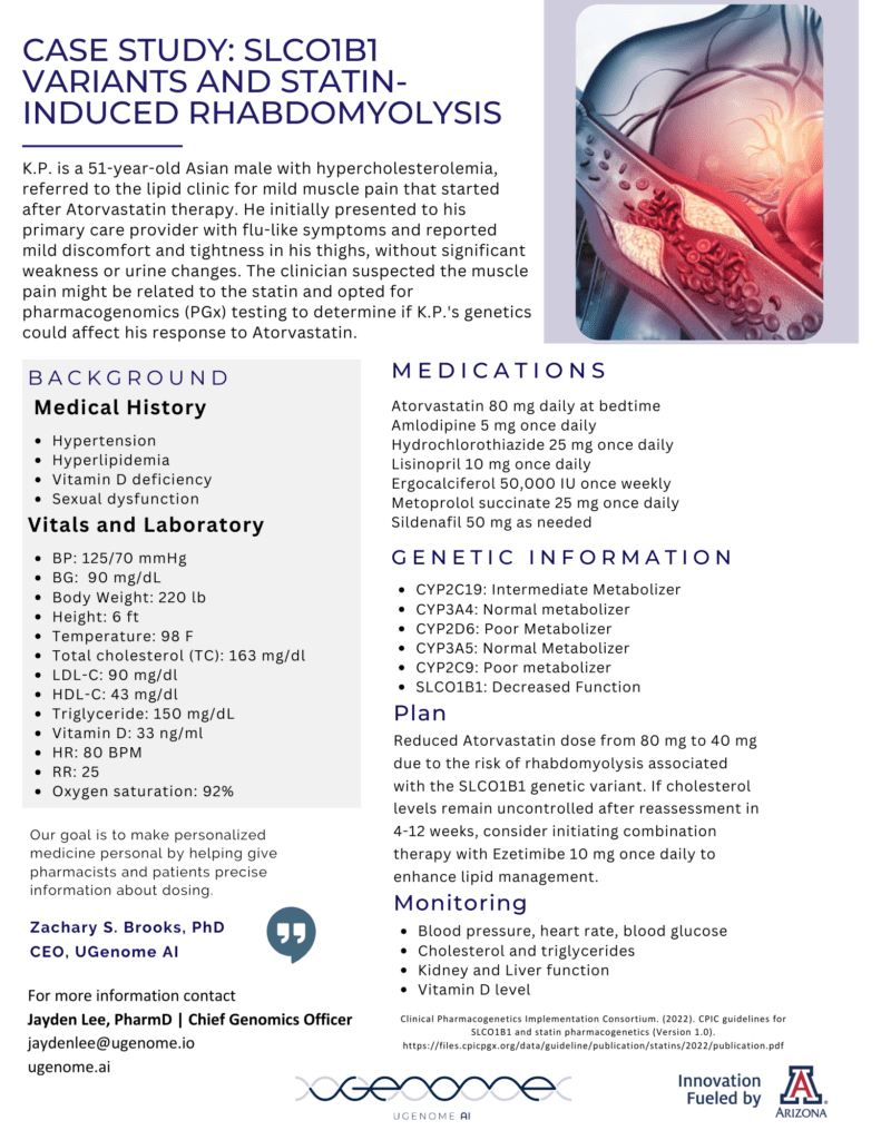 K.P. is a 51-year-old Asian male with hypercholesterolemia, referred to the lipid clinic for mild muscle pain that started after Atorvastatin therapy. He initially presented to his primary care provider with flu-like symptoms and reported mild discomfort and tightness in his thighs, without significant weakness or urine changes. The clinician suspected the muscle pain might be related to the statin and opted for pharmacogenomics (PGx) testing to determine if K.P.'s genetics could affect his response to Atorvastatin.