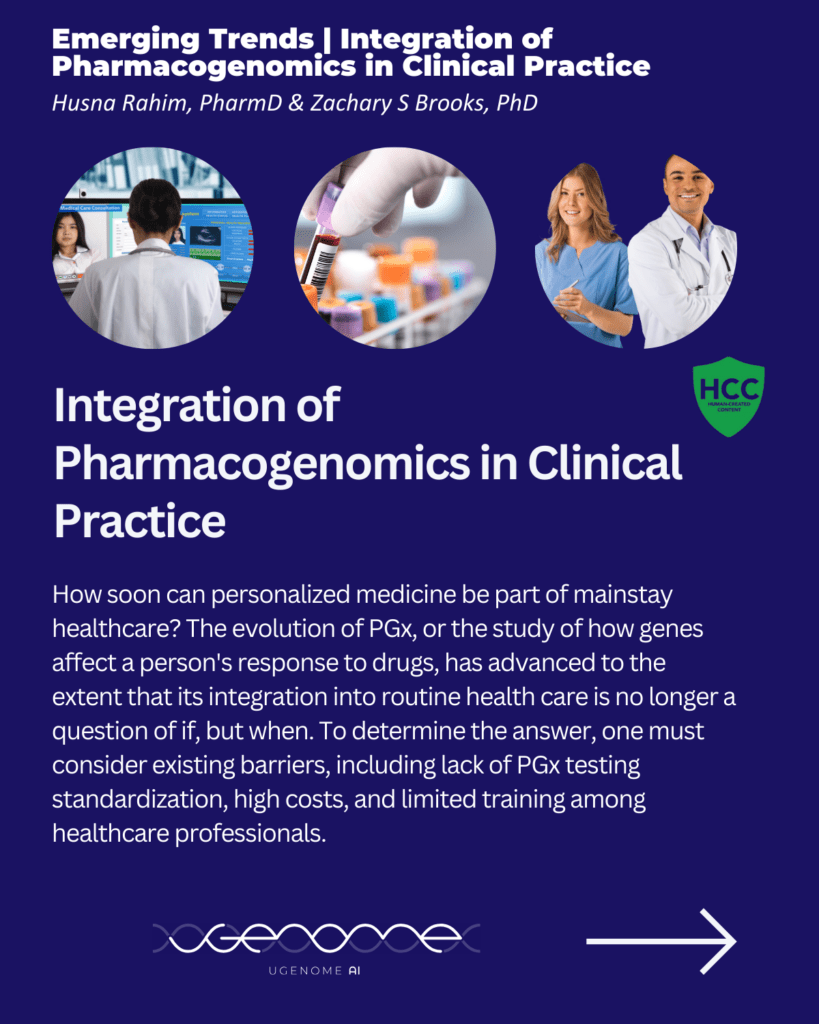 Clinicians may lack training to utilize PGx in treatment decisions. The reality of PGx adoption is in such infancy that the vast majority of physicians are ill-equipped to readily understand and apply PGx information effectively. Bridging this gap requires a multifaceted approach, including developing robust educational programs and decision support tools for practicing clinicians and incorporating comprehensive PGx curricula into medical and pharmacy schools. Moreover, interdisciplinary collaboration among geneticists, pharmacists, and clinicians is crucial to foster an environment that supports PGx application in daily medical decisions.